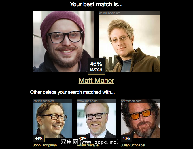 您将获得与您最相像的名人的百分比匹配,以及三名亚军。总是让人着迷的是,您看起来像神话迷的Adam Savage,是吗?