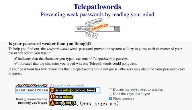 Telepathwords尝试通过使用常用短语,密码和密码的组合来预测密码中的下一个字符选择行为。因此,输入您的密码,然后查看您获得了多少刻度线。红叉表示可猜测的字符,因此您可能需要替换它们以制作令人难忘但牢不可破的密码。
