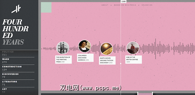 历史记录在使历史栩栩如生的迷人景点中脱颖而出。底部的栏要求您选择一个时间段,从130亿年前到今天。该图将历史文章记为小点,并点缀着较大事件的图像预览,这也表明该时期在地球上发生了多少事情。