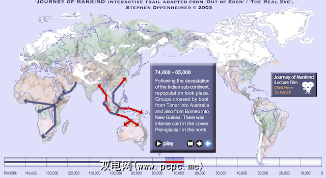 该地图在过去16万年中展示,描绘了气候和地理条件如何影响我们前辈的决策。简要介绍了迁移的每个步骤,并且对于那些想了解更多信息的人来说,总会有一个额外的视频或链接。这里有一些惊人的事实,例如在美洲之前澳大利亚是如何居住的,或者冰河时代如何改变了世界人口。