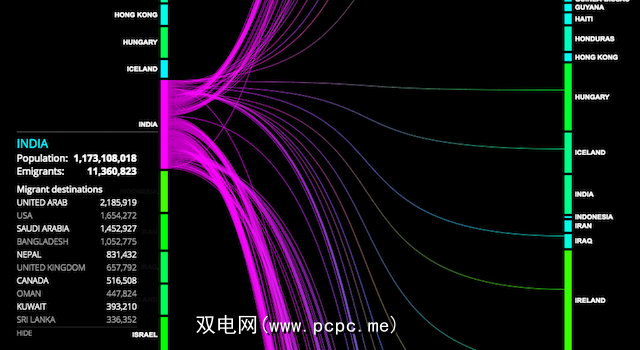 例如,如果您对大多数同胞移民到哪个国家感到好奇,在People Movin中的第一列国家中单击该国家。神经网络将绘制人员流向的图表,简单的图表将向您显示重要的数字。