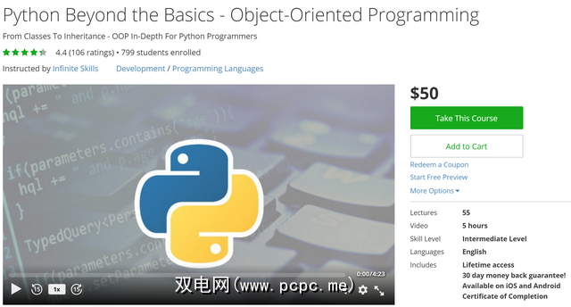 由于概念更高级且涉及更多,因此价格较高,为50美元。但是,如果您已经到达需要中级到高级课程的水平,并且知道自己喜欢使用Python,那么投资应该更容易接受。