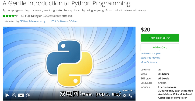 这门课程非常适合Python初学者,主要有两个原因:价格便宜,只需20美元,而且不需要花费大量时间,仅需1个小时即可完成。如果您只是将脚趾浸入语言(或一般而言的编程)中,这将使您可以尝试一下。