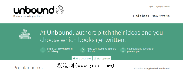 Unbound是英国面向作者的众筹和出版平台。作者将他们的想法介绍给“无界限"的听众。如果听众喜欢球场,他们可以为这项事业认捐资金。当达到筹资目标时,会写书,并将完成的产品交付给每个认捐的人(加上承诺的其他奖励)。尽管该服务的许多发行方面似乎仅限于英国,但看起来来自世界各地的作者仍然可以申请成为Unbound的一部分。