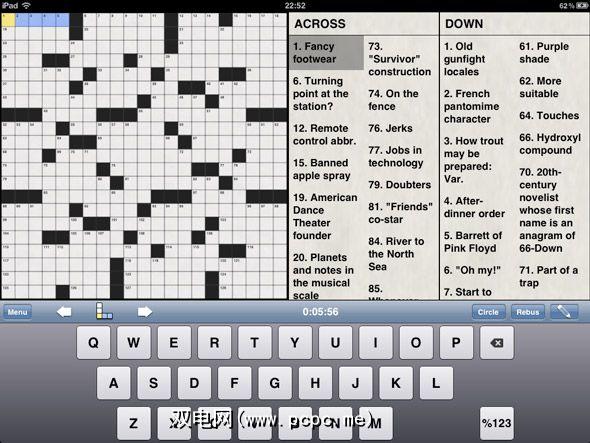 该界面使用起来很有趣,尽管特定于应用程序的键盘往往只能随意使用,但Crosswords的键盘却具有高品质的感觉。在其他按键之间混合使用 Skip , Rebus (10个字母的记事本)和 Flip 按钮时,浏览这些提示变得毫不费力。如果您能够负担得起$ 9.99的填字游戏应用程序,则可以购买Crossroads。