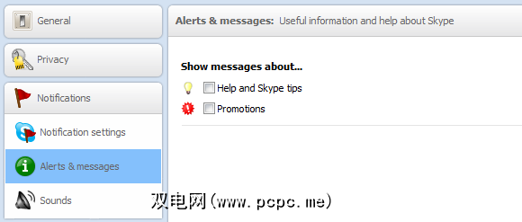 在该列表中,您还可以跳到警报和消息部分,并关闭不受欢迎的帮助和Skype提示以及促销。