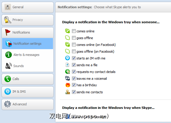 要管理您的Skype通知,请单击并转到>工具>选项…并切换到通知侧标签。在通知设置下,您会找到Windows托盘通知列表,您可以选中或取消选中它们。