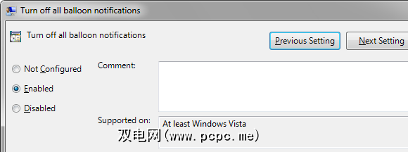 “If you enable this settings, no notification balloons will be shown to the user.” Hence, to disable the balloon notifications, you have to select Enabled for this setting. To enable the balloon tips, select Disabled or set it to Not Configured.