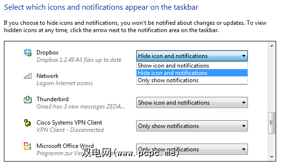要关闭特定项目的通知,请在列表中找到它,并从右侧的下拉菜单中选择隐藏图标和通知。