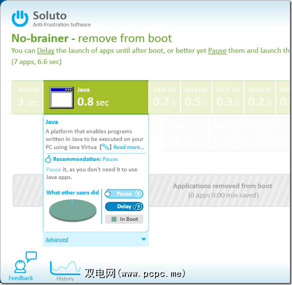 从那里,您可以选择将应用程序延迟到启动已完成,或将其完全从启动中删除。对选择进行了清楚的说明,它还有助于显示其他用户对该特定项目的决定。