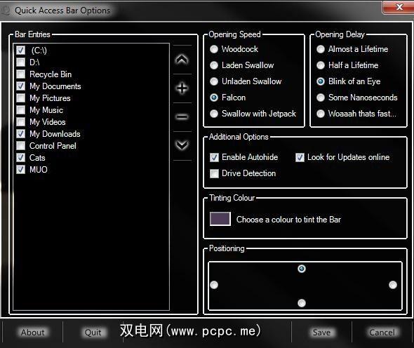 使用Coolbarz,您可以在桌面上的任何位置(顶部,底部,右侧,左侧)创建快速访问工具栏,并用您经常使用的所有应用程序,文件夹甚至文件填充它们。您可以自定义这些工具栏的几乎所有内容,从外观和淡入淡出时间到按钮的位置,可滚动性等等。