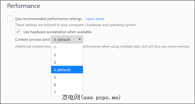 Content Process Limit是Firefox的新电解或多进程体系结构的功能。这样,每个选项卡都作为Firefox的单独实例运行,从而可以访问更多的硬件资源。