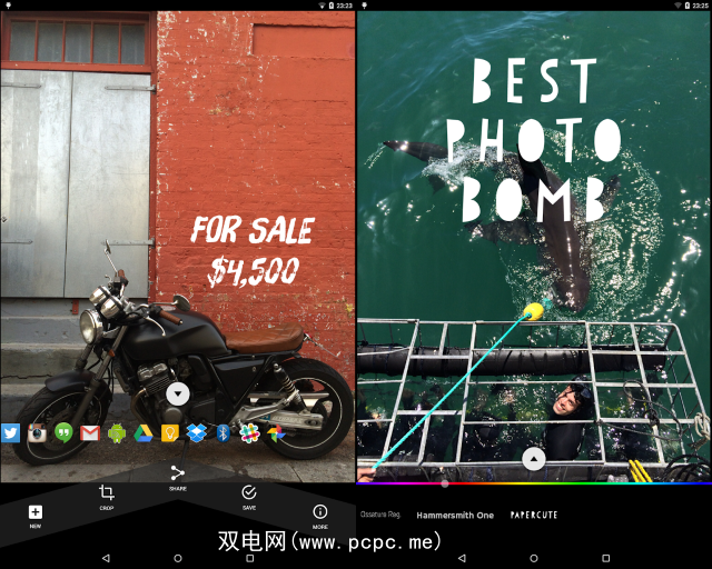 在Android和iOS上免费提供,您所需要做的就是从图库中选择图像或使用相机拍摄新照片。快速将显示一个文本字段,您可以点击以进行编辑。您可以选择各种各样的版式,也可以自定义颜色。完成后,保存并共享。