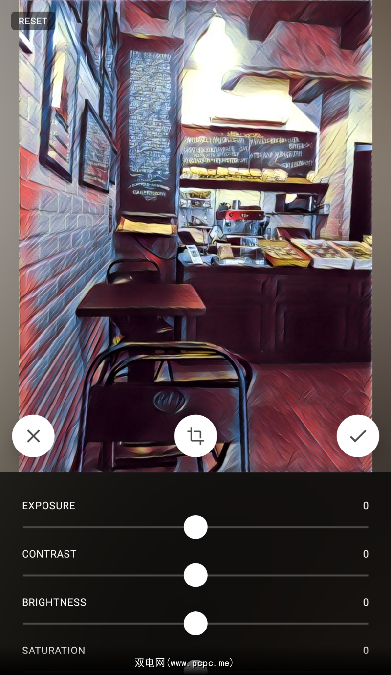有了Prisma,一旦您选择了照片和滤镜,它就会立即应用滤镜(大约需要10-20秒),然后向您展示最终图像的预览。然后,您可以左右滑动手指以表示过滤器的强度,从0%到100%。并且有通常的图像编辑选项,例如曝光,对比度,饱和度等。