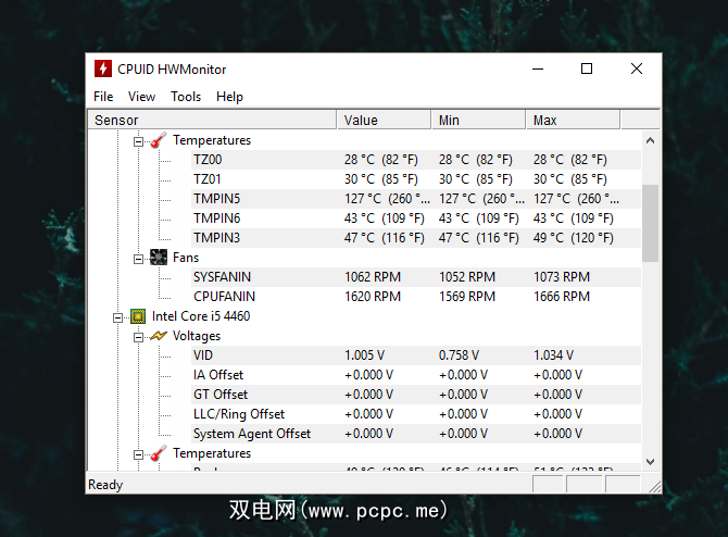 HWMonitor的简单界面也使所有值都易于查看和理解。当然,您也可以通过 File 选项保存此信息,以进行进一步的故障排除。