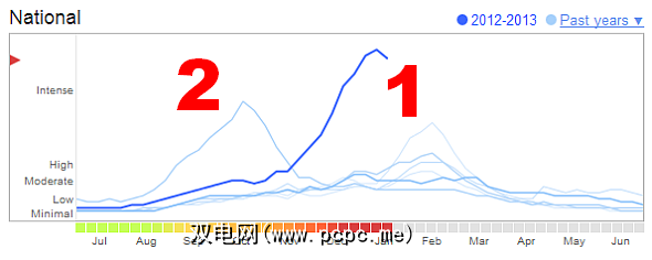 您可以从深蓝色线条(1)看出,流感症状的搜索量甚至超过了2009年的猪流感全球大流行(2)。