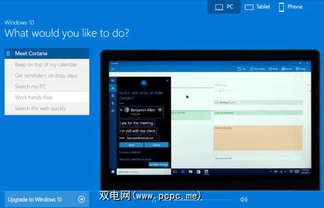 该页面上有一系列视频,这些视频演示了Windows 10功能的11个常规主题,其中包括跨设备,保持井井有条或浏览网络。选择所需的Windows 10平台(PC,平板电脑或手机)和主题(例如 Meet Cortana ),然后选择一个您感兴趣的功能,例如免提工作,相应的演示视频将开始播放。