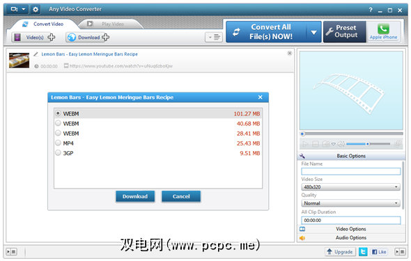 接口和可用性:从Web应用程序继续运行,任何视频转换ter(AVC)是适用于Windows或Mac的桌面应用程序,可以处理您所有的YouTube下载和转换需求。要下载YouTube视频,请将URL复制到剪贴板,然后单击AVC中的“下载"按钮。该程序会自动从剪贴板中提取URL,并显示视频的缩略图,标题和长度。然后,您可以选择几种格式进行下载,然后立即开始下载。该界面比普通的Web应用程序丰富得多,但是它仍然足够易于使用而不会带来太多麻烦。