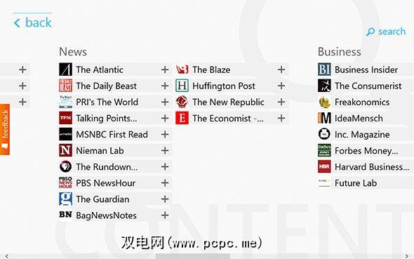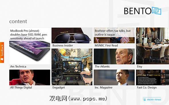 这是令人惊讶的,但是没有适用于Filpboard或Feedly的Windows 8版本,也没有Google Reader的正式客户端。如果您想要这样的东西,则将不得不依赖News Bento之类的应用程序,它为您提供了一种从网络上快速浏览各种站点的方法。
