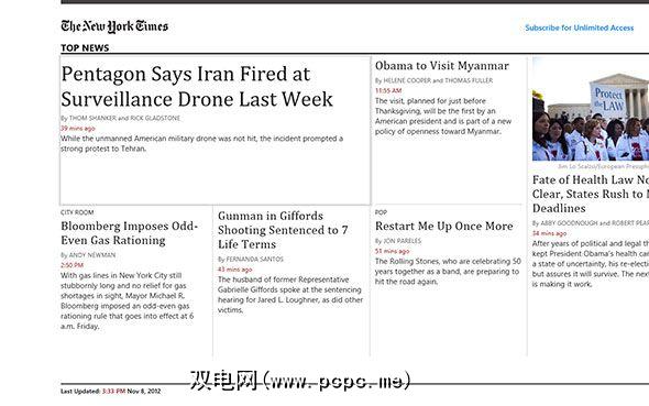 《纽约时报》应用程序毫无疑问地以Metro风格排列文章。向左滚动以查看更多,单击文章以阅读。