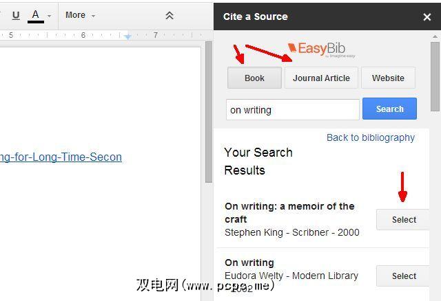 找到所需内容后,在结果中,只需单击选择按钮,然后单击“将书目添加到文档"按钮。