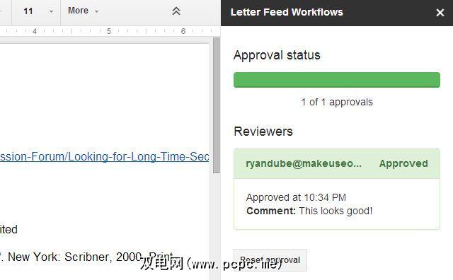 在Google Doc本身中,工作流显示批准状态。如果有多个需要批准的人,它会向您显示到目前为止有多少人批准了该文件。