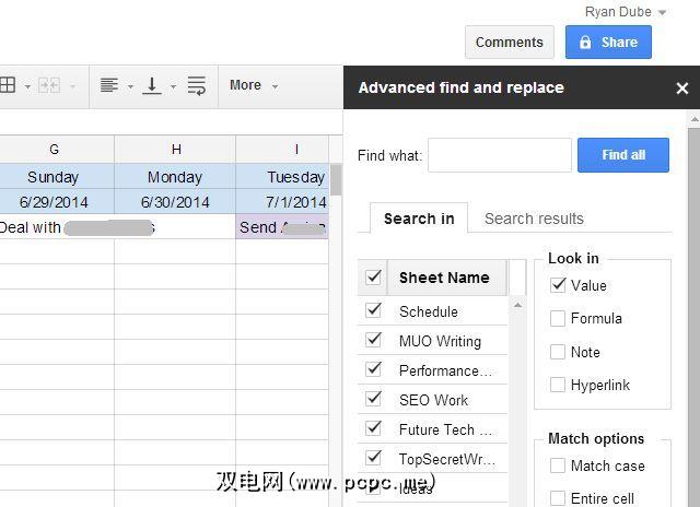 Ablebits查找和替换使您可以在电子表格中进行一些真正的高级查找和替换操作。它使您不仅可以搜索值,还可以搜索工作表中的注释或公式。您还可以选择特定的工作表名称,也可以仅搜索活动工作表或工作簿中的所有工作表。