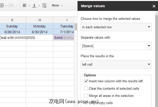 另一个非常有用的Ablebits插件是“合并值"工具,该工具可以让您执行在不同的列中使用数据进行一些真正有创意的操作,然后将最终结果放在您告诉它的任何结果列中。