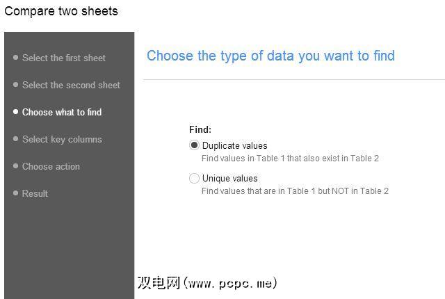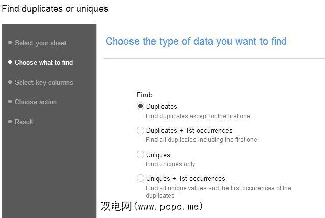 如果您选择查找重复项,则附加组件将引导您通过向导来选择范围和您要搜索的数据。