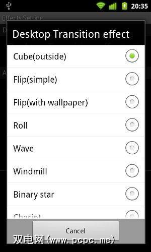 最后但在此简短的概述中,最重要的是过渡动画。 Go Launcher EX提供了十种不同的动画,可在主屏幕之间滑动: