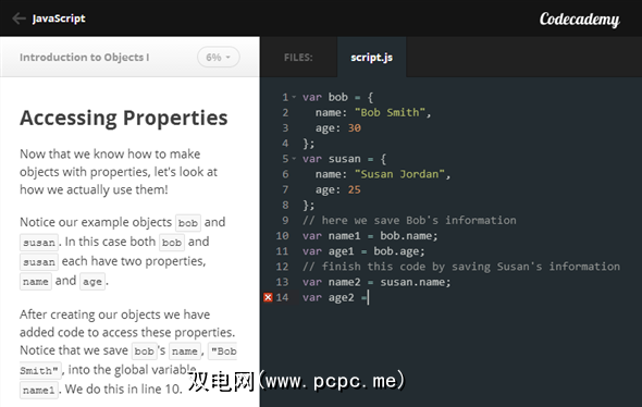 如果您要寻找既免费又且着重于这样做的资源,则需要Codeacademy的JavaScript Track。本JavaScript指导课程使用了最少的文字说明,所有文字说明都塞在了侧栏中。屏幕的大部分内容由运行在浏览器中的优雅的代码编辑器占用。要完成本课程,您需要完成实际的(简单的)编码分配: