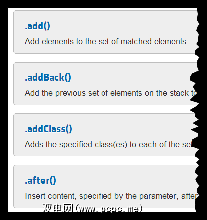 另一个关键参考资源是jQuery API文档。就像MDN一样,此API文档乍一看似乎令人生畏,令人恐惧并且完全不友好。是的,这些参考资源都不会通过温和的解释来帮助您-但是是通过全面,非常值得信赖和权威来弥补这一点。