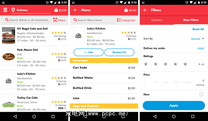 该应用程序的界面是干净且可导航的。清单显示了餐厅类别,菜单项,营业时间,最低订单成本,送货费用,预计送货时间以及用户评分和评论。搜索选项相对比较裸露,但包含所有必需项。