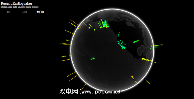 免费提供的多个出色的Chrome实验之一,该项目可绘制地球上最近20、100或200次地震。它不使用平面图,而是使用地球并按峰值绘制地震的严重性,即峰值越长,强度越高。