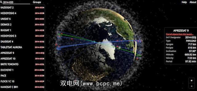 此处介绍了读取方法。红点是卫星。蓝点是火箭弹。白点是碎片。现在,就像使用Google Maps一样,用鼠标平移和扫描,并探索太空中的东西!您可以单击任何对象以获取有关它的更多详细信息,以及查找随它启动的所有其他对象。仅这些轨迹就令人着迷!在本文介绍的所有站点中,我绝对喜欢这个站点。