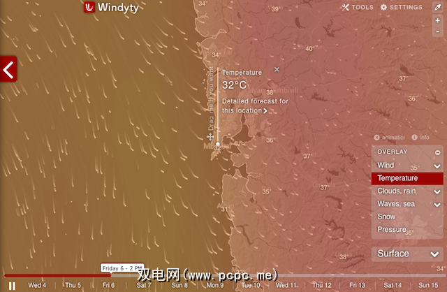 您可以在一些覆盖层之间进行选择:风,雨和云,温度,海浪,雪和压力。搜索您的城市,您将看到接下来几天的天气预报。
