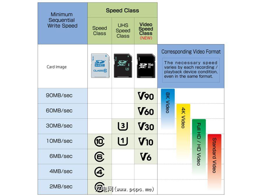 视频速度等级设置了最低顺序写入速度,这在拍摄视频时必不可少。视频的分辨率越高,所需的速度就越快。视频共有五类: