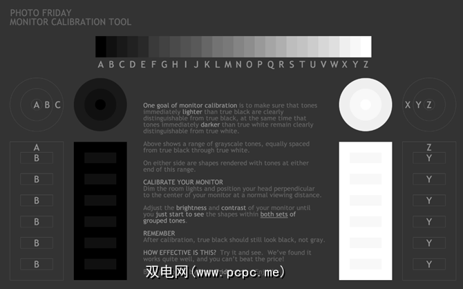 在线监视器测试网站提供了一系列交互式测试,可修复您的屏幕颜色。将鼠标移至顶部时,将显示菜单。从测试开始,检查黑白色调光谱的亮度和对比度。类似于我们在Photo Friday网站上介绍的测试。