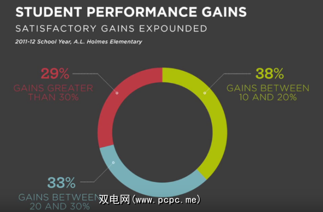 这种方法使每个学生都有自己的学习途径,可以根据自己的需求进行定制。这样,教师可以轻松查看哪些学生落后,并为这些学生提供更多个性化的教学。正如您在下面看到的,结果非常棒。 (每增加10%的收益就等于一年的学习价值。)