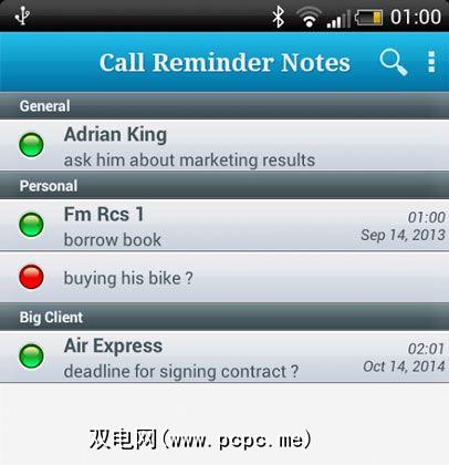 适用于Android的呼叫提醒说明($ 1.99)使您可以设置提醒以在特定时间呼叫联系人,或者设置提醒在下次致电时弹出,或者他们致电给您。有时可能需要将信息中继给客户端,但对于特殊呼叫而言并不紧急。使用“通话提醒说明"为下一次对话添加带有谈话要点的弹出窗口。断开通话后,您可以选择记笔记或设置提醒,这样您的所有想法都会浮现在脑海。