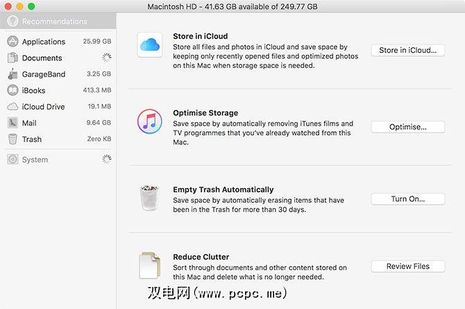 存储管理应用程序还会告诉您GarageBand和Mail等应用程序正在使用多少空间。有趣的是,我注意到macOS Sierra在安装后为我留下了大约30 GB的可用磁盘空间,其中不包括安装程序占用的5 GB。