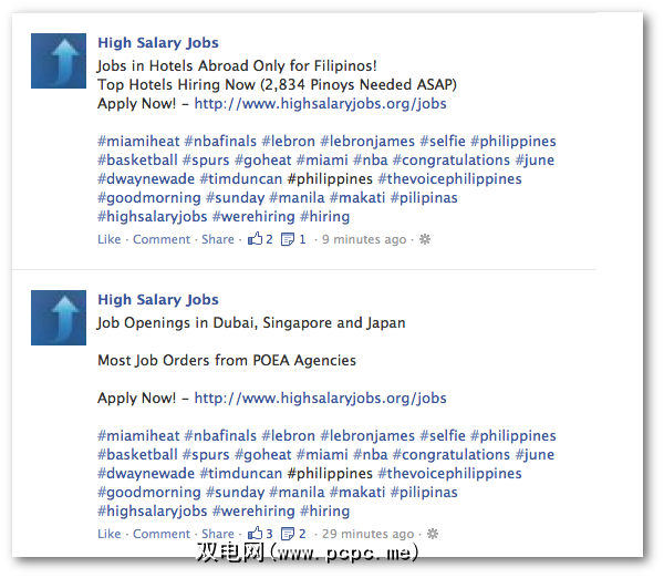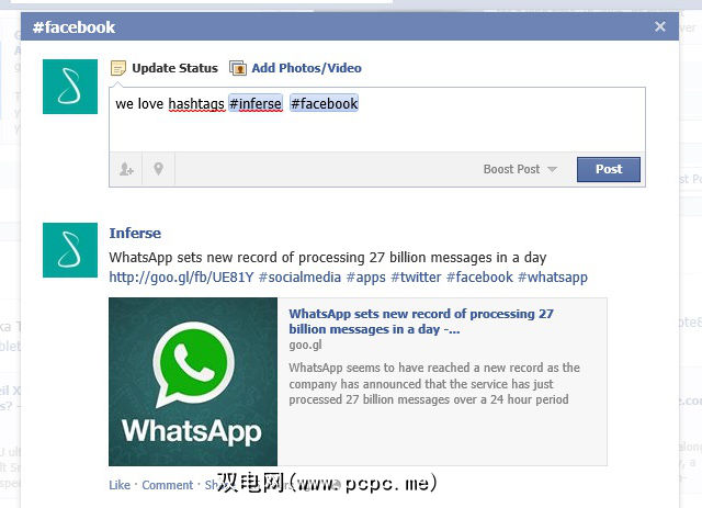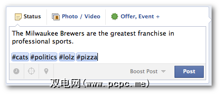 在Facebook上创建标签所需要做的全部工作就是在一系列没有空格且连在一起的单词前加一个井号,然后打“ enter"。因此,如果我想在Facebook上创建主题标签,只需在我的Facebook状态上键入#PCPC.me,它就会立即成为主题标签。就是这么简单。