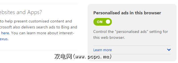 下一步,查看该框的底部,然后点击< strong>管理我的Microsoft广告和其他个性化信息。这将带您到此页面,您可能会注意到这些页面也都已打开(如果以前已关闭)。同样,将它们改回就像用鼠标单击一样简单。
