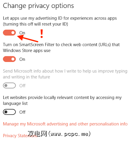 您会注意到的第一件事(如果您之前已将其关闭)是您的“广告ID"已重新打开。由于这意味着会从您那里收集信息来为您投放有针对性的广告,因此我始终将其关闭。很好的尝试微软,试图偷偷溜走我。继续并再次将其关闭,但是请注意,您仍然会看到广告。