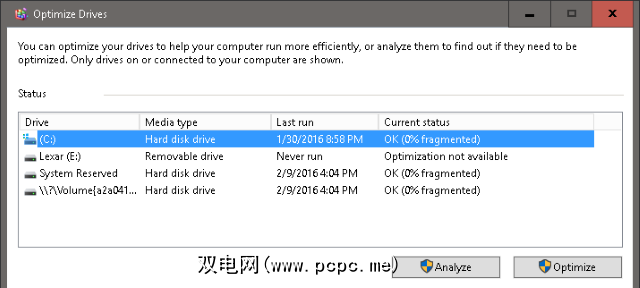 该窗口将显示位于以下位置的磁盘驱动器并会自动选择存在的主驱动器(默认情况下通常命名为C:/)。您可以分析驱动器,该驱动器将显示硬盘上碎片的百分比,或者立即进行优化以开始该过程。
