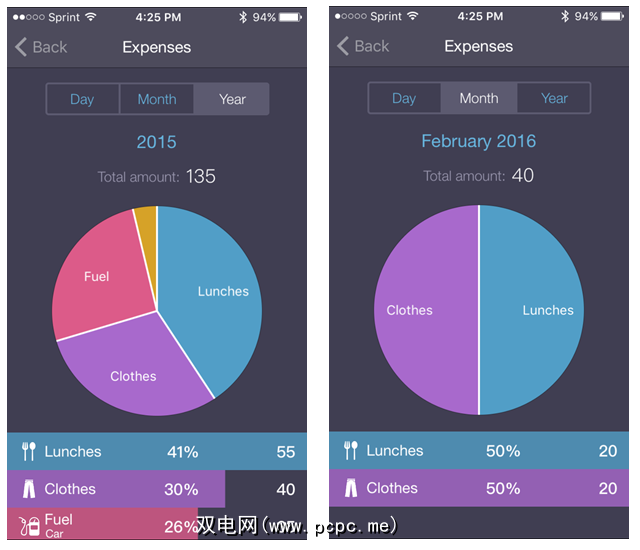 然后,您可以通过易于阅读的饼图快速查看每日,每月和每年的费用。这为您提供了一种理想的方式来查看您是否在诸如食品,运动或娱乐等特定项目上花费过多。