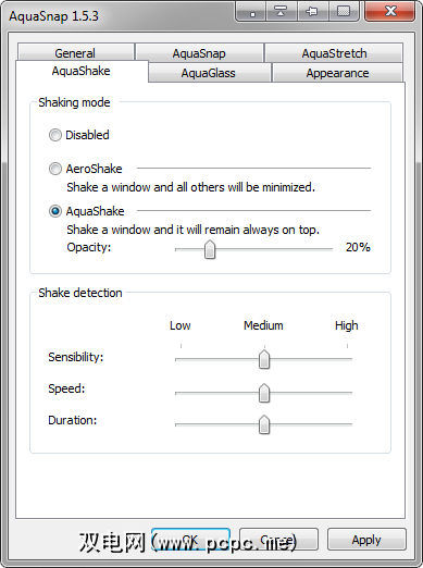 与前面提到的工具一样,AquaSnap提供了许多功能。其中之一是摇动窗户,使其立即停留在顶部并更改其不透明度。可以自定义抖动检测的灵敏度,速度和持续时间。
