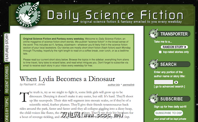 该网站已经存在了一段时间,因此档案中有很多材料,涉及诸如外星人,虚拟现实,未来的社会,太空旅行,时间旅行等等。哎呀,甚至有一些幻想!基本上,这是怪胎的乐趣,因此,如果这些类型对您而言听起来很有趣,那么您会在这里喜欢它。