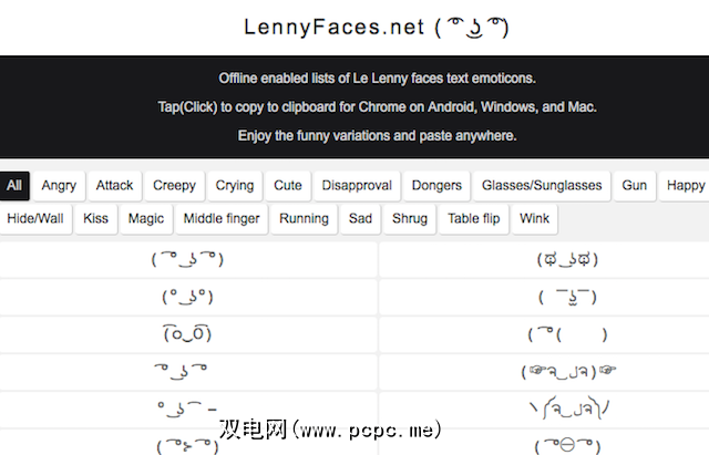 在LennyFaces.net上,您会发现这张流行表情符号的所有不同变体的表格,从运行Lenny到翻转Lenny的桌子。点击或单击顶部的类别以过滤列表,找到要查找的内容后,单击或单击该项目即可立即将其复制-无需CTRL + C。