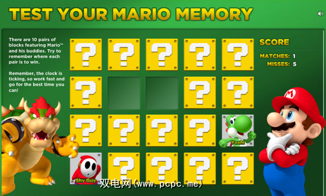 您可以还可以玩 Mario Memory ,其中每个角色都隐藏在两个单独的面板后面。您必须单击面板,记住每个人都在哪里,然后清除面板。